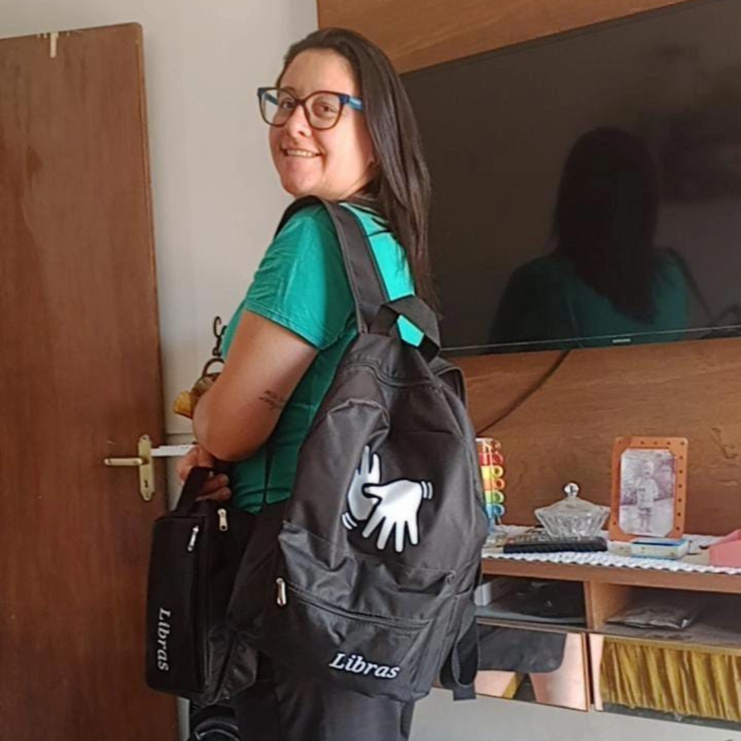 - Flávia usando a sua mochila e estojo de Libras (edição limitada) que ganhou de brinde como aluna diamante do mês, em Bagé/RS.